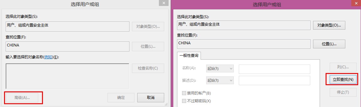 我们点“高级”- 在“选择用户和组”窗口中点“立即查找”,找到系统当前的用户,比如笔者的用户名为china/administrator,如下图所示: