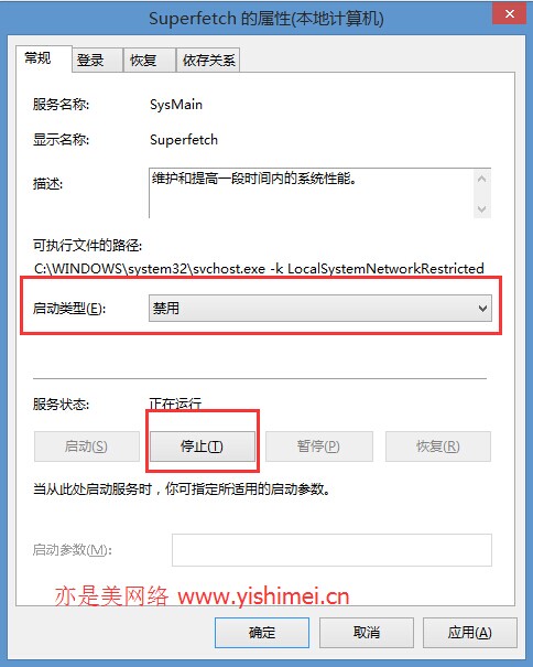 先点击停止,然后将启动类型设置为”禁用“,完了点击应用即可。