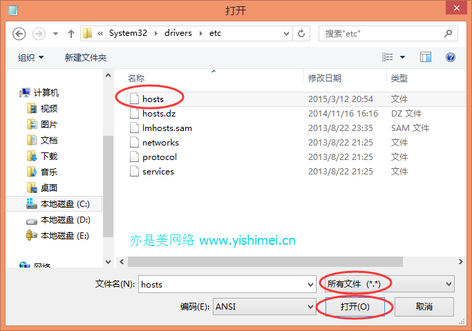 最近有很多同学反应放在C:\WINDOWS\system32\drivers\etc中的hosts文件编辑修改后无法保存,笔者也遇到过这种情况,并且在前面的文章中也给大家提供有解决办法,hosts文件能编辑无法保存这种情况一般出现在win8/8.1及以后的系统win10中,之前的xp、win7基本没有这种情况,这是因为某些情况下,win8/8.1以及win10对系统文件的权限要求比较高,而我们却没有修改的权限引起的,当然了,无法修改并不是一直存在的,也是部分同学在部分时间进行编辑后无法保存,那么今天亦是美网络就给大家再提供一个修改并保存hosts文件的方法吧!