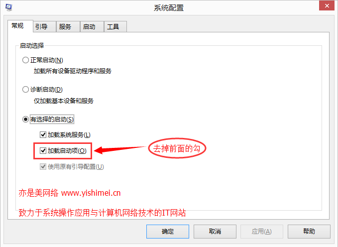 找到"有选择的启动"里的"加载启动项",将其前面的勾去掉,点击"应用";