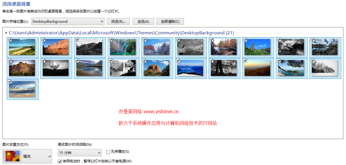 在这里我们可以勾选掉我们不喜欢的壁纸,并且还可以设置多久更换一次桌面壁纸等。