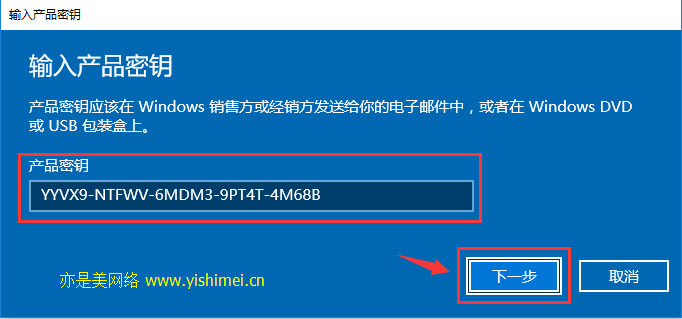在输入产品秘钥界面,我们输入用于升级至win10企业政府版的密钥YYVX9-NTFWV-6MDM3-9PT4T-4M68B,
