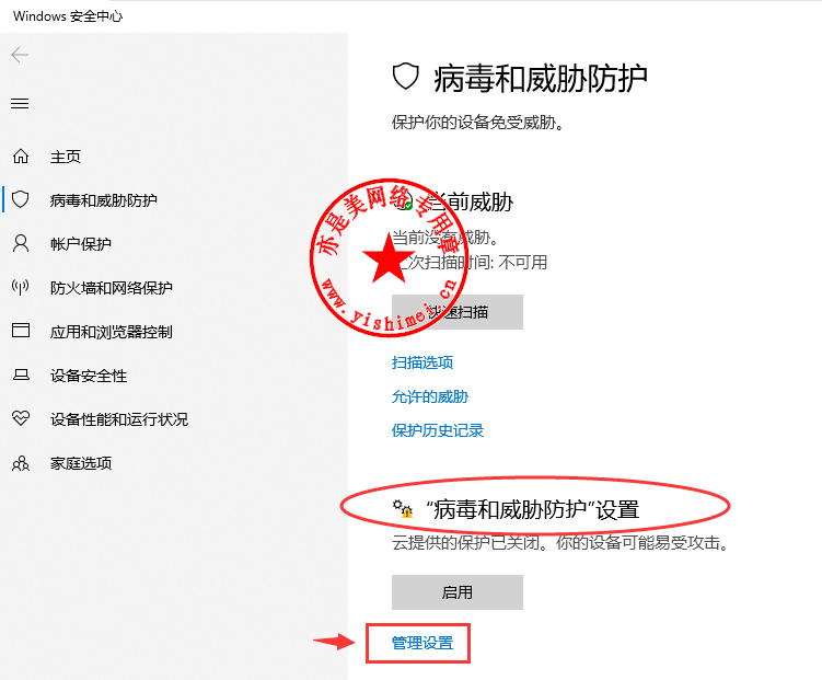 找到上图中的“病毒和威胁防护”设置,点击其下面的“管理设置”,