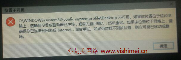 昨晚在Q群有个同学说他的win10(技术预览版)系统开机后,出现了“C:\WINDOWS\system32\config\systemprofile\Desktop不可用”的错误提示,这一看就是桌面的路径配置出现错误了,其实这个错误在windows7、windows8/8.1的系统版本上也经常出现,大多是因为系统补丁的更新、非常规软件的卸载以及系统测试版本不稳定引起的,不管是哪种原因,下面亦是美网络小编就教给大家两个办法来解决桌面位置不可用这个问题。