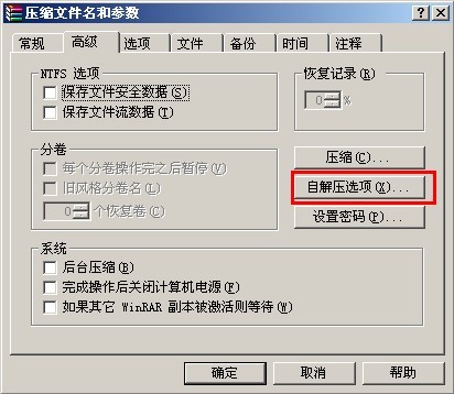 我们勾选上“创建自解压格式压缩文件”后,切换到“高级”选项卡,如下图