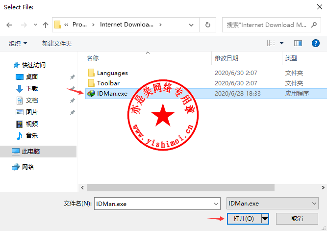 定位至IDM的安装路径,默认在C:\Program Files (x86)\Internet Download Manager,然后单击选中“IDMan.exe”,点击“打开”,