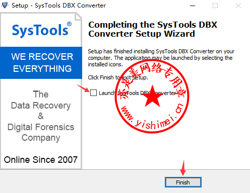 去掉“Launch SysTools DBX Converter”前面的勾,点击“Finish”,暂不要打开软件,
