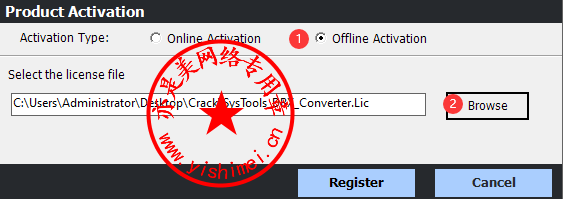 先勾选“Offiline Activation”,然后点击“Browse”,定位至刚才生成的SysTools_DBX_Converter.Lic文件,点击“Register”,