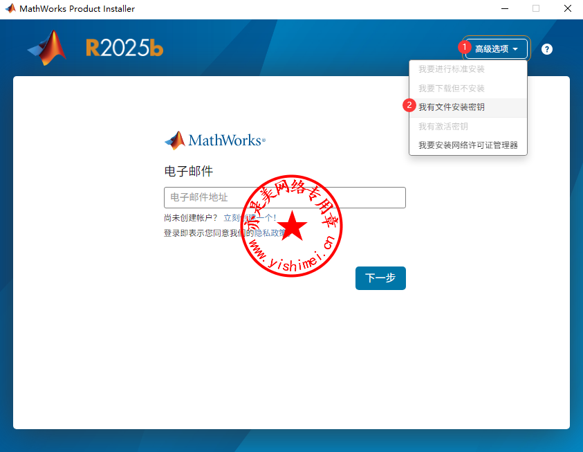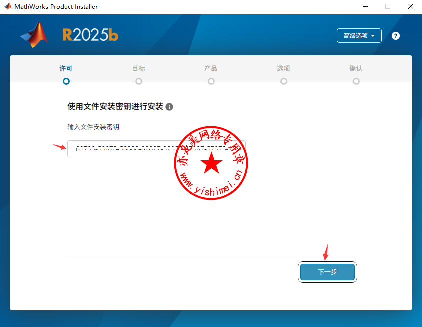 点击右上角的“高级选项”,选择“我有文件安装密钥”,