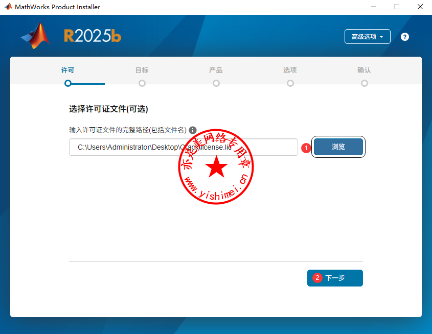 点击“浏览”,定位至Crack文件夹里的license.lic文件,点击“下一步”,