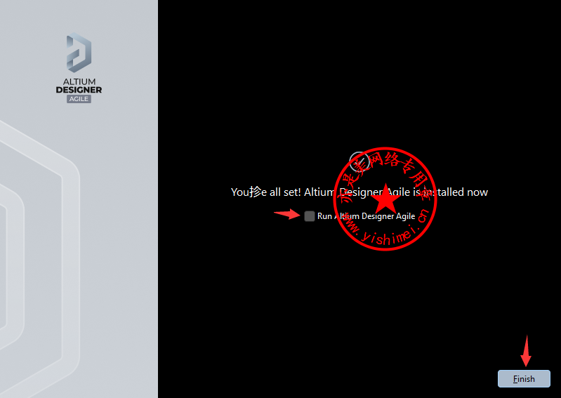 安装完成,去掉“Run Altium Designer Agile”前面的勾,点击“Finish”,暂不要打开软件,