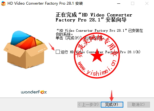 去掉“运行WonderFox HD Video Converter Factory Pro 28.1”前面的勾,点击“完成”,暂不要打开软件,