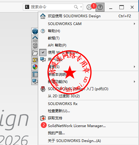 点击右上角的“?”图标,如上图所示,然后点击“SolidNetWork License Manager...”,