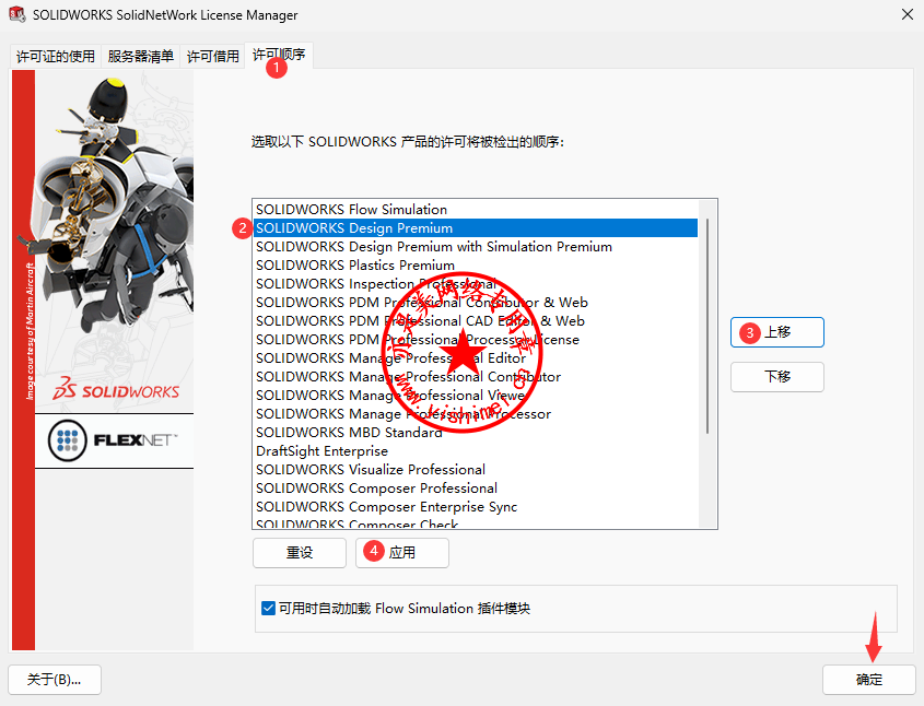 在打开的窗口中切换至“许可顺序”选项卡,然后单击选中“SOLIDWORKS Design Premium”或自己需要的版本,再点击右侧的“上移”,将其移至最上面,点击“应用”,完成后点击“确定”即可。