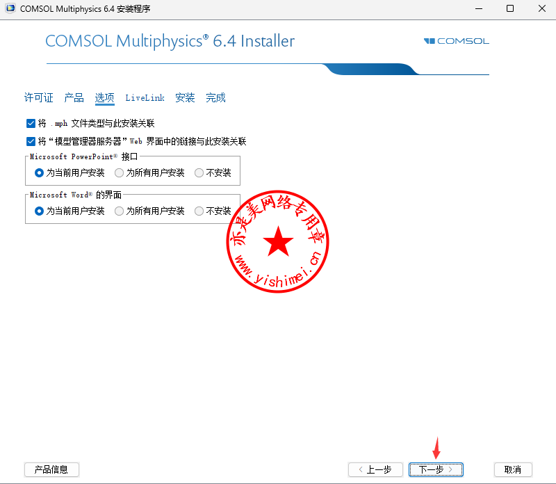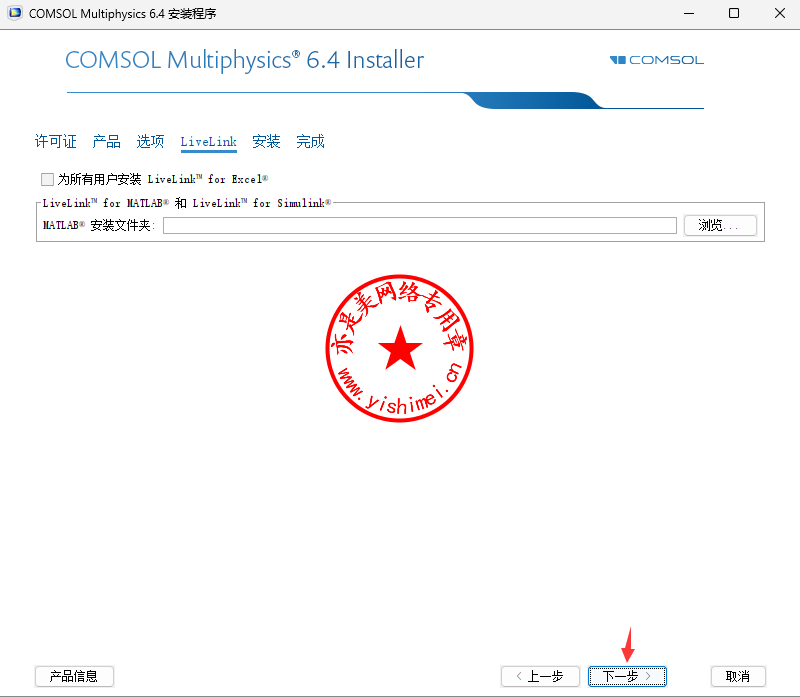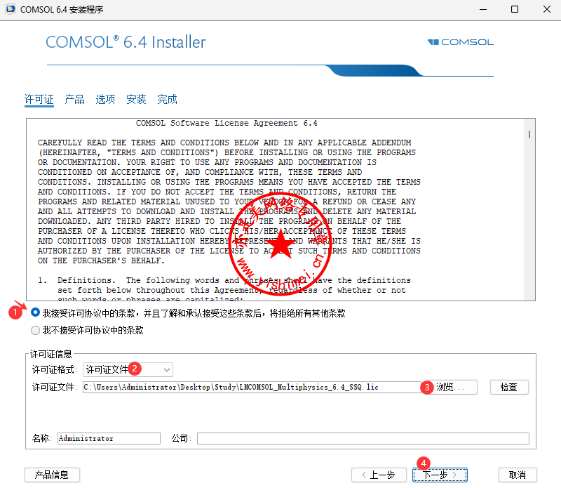先勾选“我接受...”,在许可证格式那里选择“许可证文件”,再点击“浏览器”,定位至Study文件夹里的LMCOMSOL_Multiphysics_6.4_SSQ.lic文件,点击“下一步”,