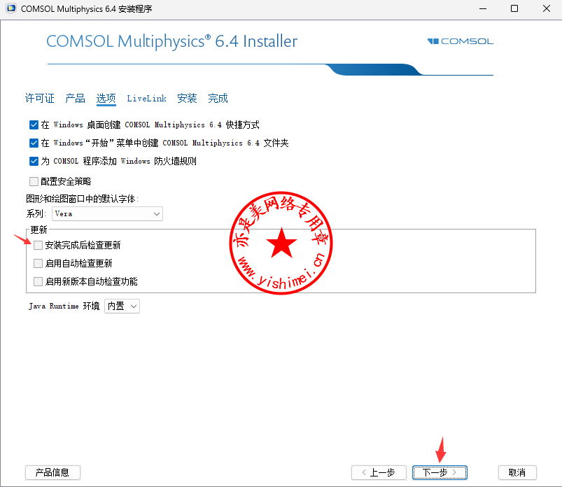 去掉“安装完成后检查更新”前面的勾,点击“下一步”,