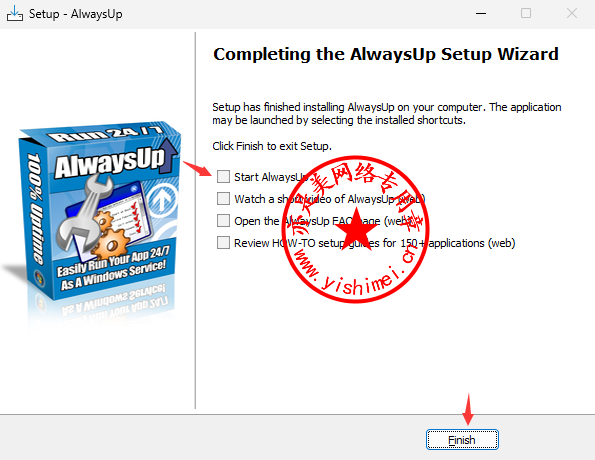 去掉“Start AlwaysUp”前面的勾,点击“Finish”,暂不要打开软件,