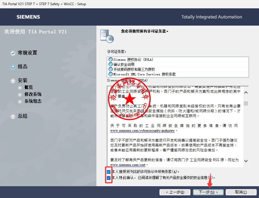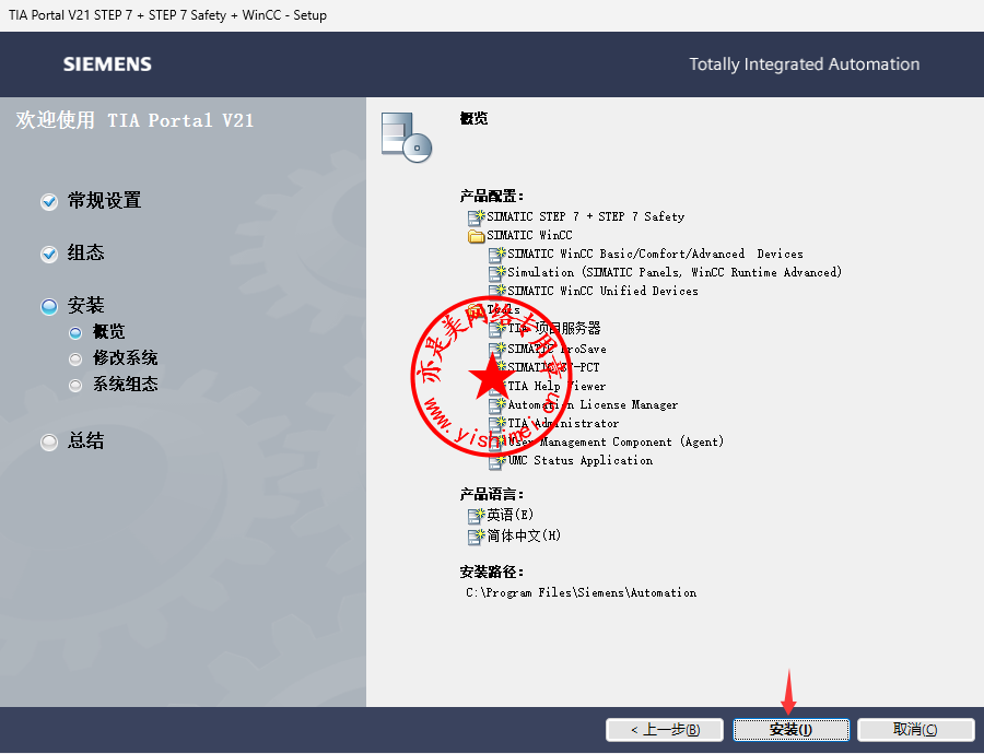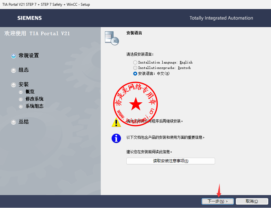 下载<Siemens SIMATIC TIA Portal V21中文版+研习文件>压缩包,解压缩后进入Siemens SIMATIC TIA Portal V21文件夹,双击TIA_Portal_STEP7_Safety_WinCC_V21.iso文件,以Windows资源管理器的方式打开,然后双击里面的Start.exe开始安装,