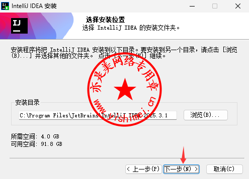 下载<JetBrains IntelliJ IDEA Ultimate 2025.3.1中文版+研习文件>压缩包,解压缩后双击ideaIU-2025.3.1.exe开始安装,