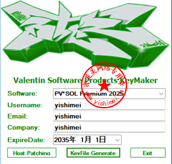 先在“Software”处选择“PV*SOL Premium 2025/2026”,然后在“ExpireDate”处设置一下过期日期,根据自己需要设置几十、几百年均可,最后点击“KeyFile Generate”,