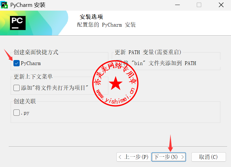 勾选“Pycharm”,点击“下一步”,