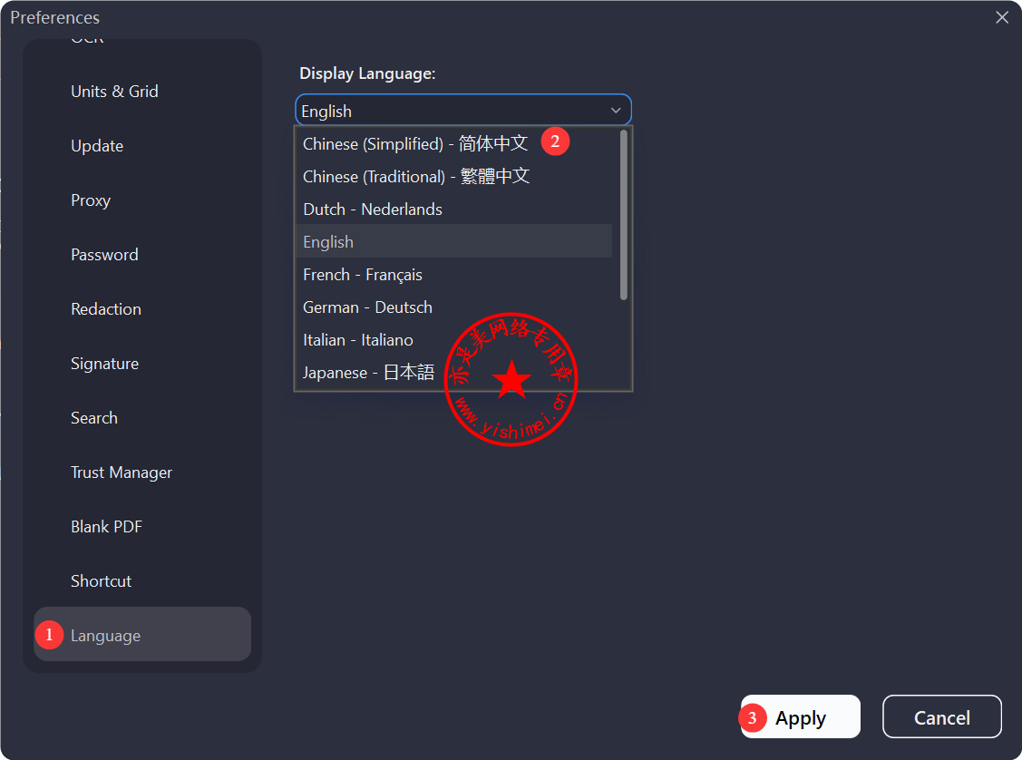 将左侧拉至最底,点击“Language”,在右侧选择“Chines(Simplified)- 简体中文”,点击“Apply”即可变为中文界面。