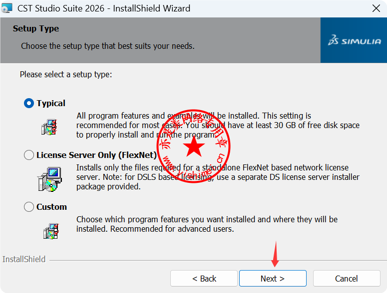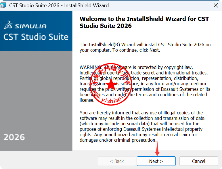 下载<DS SIMULIA CST Studio Suite 2026 SP1+研习文件>压缩包,解压缩后进入DS SIMULIA CST Studio Suite 2026文件夹,双击setup.exe开始安装,