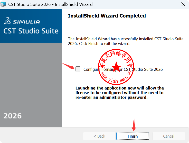 去掉“Config Licensing for CST Studio Suite 2026”前面的勾,点击“Finish”,