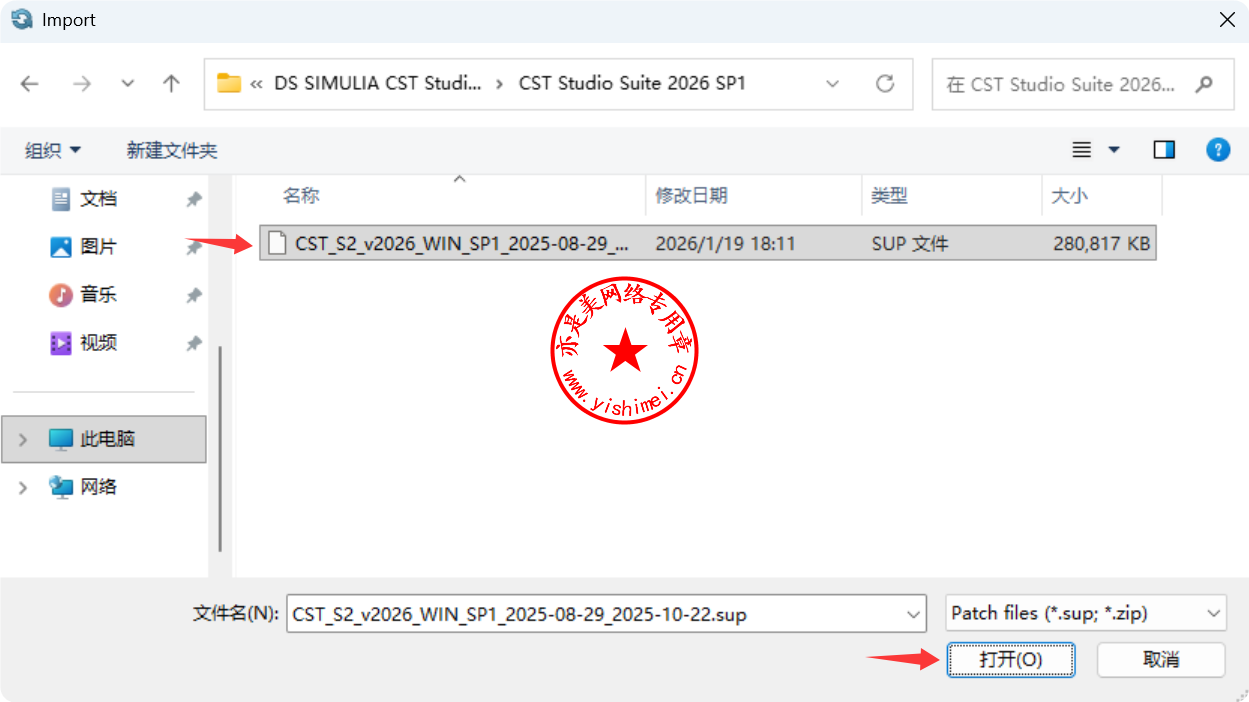 定位至DS SIMULIA CST Studio Suite 2026 SP1文件夹下的CST_S2_v2026_WIN_SP1_2025-08-29_2025-10-22.sup文件,点击“打开”,