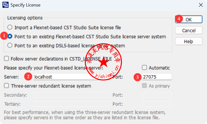 第一次打开软件会弹出该界面,先勾选“Point to an existing Flexnet-based CST Studio Suite License server system”,然后在Server处输入Localhost,在Port处输入27075,点击“OK”,