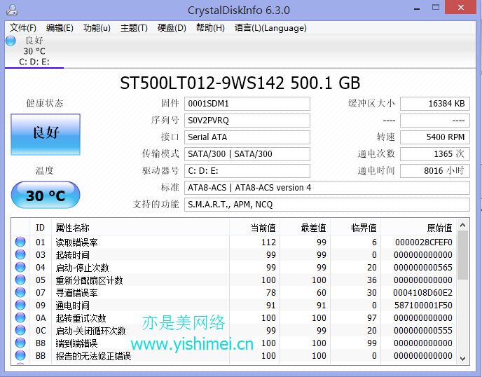 从上图可知,CrystalDiskInfo6.3.0中文版不仅可以很方便显示出硬盘的固件、序列号、接口类型、传输模式、缓存大小、转速等重要参数信息,还可以检测出硬盘的健康状况、温度、通电时间和通电次数等信息。(通电次数,可以简单的理解为开机次数,通电时间可以理解为硬盘的工作时间),很方便吧?!