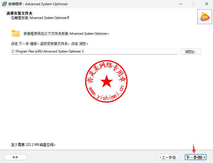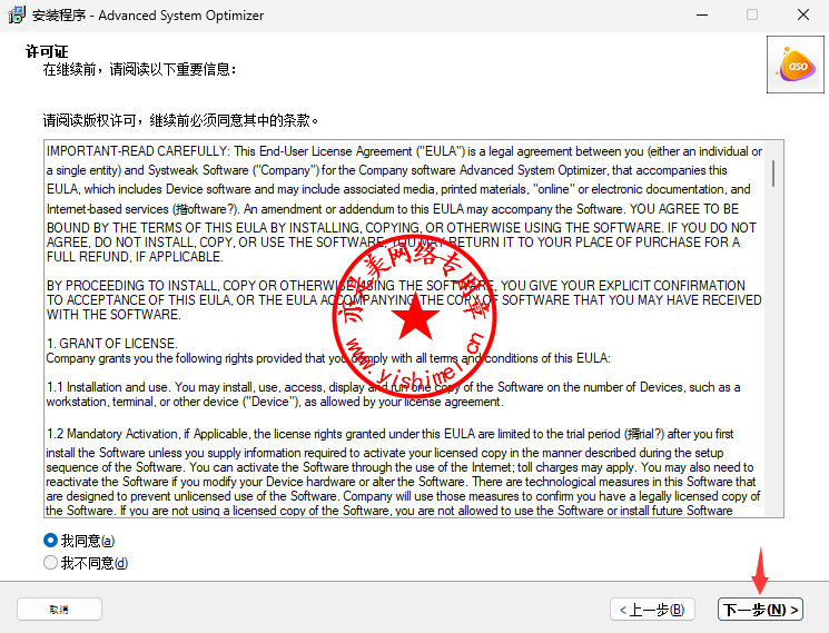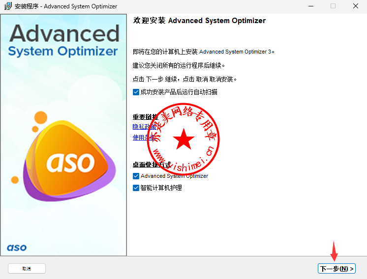 下载Advanced System Optimizer 3.81.8181.283中文版+研习文件压缩包,解压缩后找到里面的安装文件asosetup.exe双击开始安装,如下图所示,